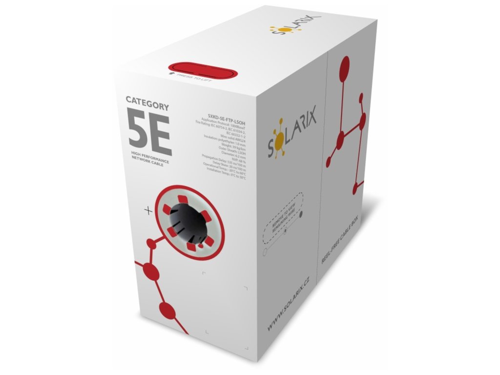 Instalační kabel Solarix s označením SXKD-5E-FTP-LSOH je spolehlivý stíněný kabel kategorie 5E, který je určený pro provoz ethernetových protokolů, včetně 2.5GBASE-T a 5GBASE-T*. Konstrukce kabelu je F/UTP, typ pláště LSOH s třídou reakce na oheň Dca-s1,d2,a1. Vodiče kabelu jsou vyrobeny z kvalitního měděného drátu s čistotou mědi 99,97 %. Kabel bez problémů splňuje požadavky z mezinárodních standardů ISO/IEC 11801, EN 50173 a ANSI/TIA 568.2-D. Výkonové parametry tohoto kabelu byly otestovány nezávislou testovací zkušebnou FORCE TECHNOLOGY v rámci programu EC Verified, a to na nejvyšší úroveň tzv. Component Level. Certifikát je k dispozici zde na webu v záložce ''Odkazy'' nebo přímo na stránkách laboratoře FORCE. V případě CPR (nařízení EU č. 305/2011) je kabel testován u nezávislé laboratoře FORCE TECHNOLOGY v systému posuzování vlastností AVCP 3. Stejně jako ostatní kabely Solarix, je i kabel SXKD-5E-FTP-LSOH značen metráží po 1 m v rozsahu od 0 do 305 m. Kabel je dodáván ve vysoce odolném třívrstvém leštěném kartónovém boxu (vždy barevně odlišeném podle typu kabelu), na kterém jsou uvedeny všechny nezbytné produktové informace, včetně čárových kódů, výrobní šarže, popisu a nejdůležitějších technických parametrů. Technické parametry Kategorie: CAT5E Podporované protokoly: 2.5/5GBASE-T a nižší Stínění: fólie kolem všech 4 párů Šířka pásma: 100 MHz Typ a velikost vodiče: měděný drát 0,50 mm ± 0,005 mm Izolace a průměr vodiče s izolací: HDPE 1,0 mm Třída reakce na oheň, typ pláště: Dca-s1,d2,a1, LSOH Barva pláště: fialová RAL 4005 Průměr kabelu: 6,2 mm Váha: 40 kg/km NVP: 68 % Propagation delay: 535 ns/100 m Delay skew: nižší než 45 ns/100 m Skladovací teplota: -20 °C až 60 °C Provozní teplota: -20 °C až 60 °C Teplota při instalaci: 0 °C až 50 °C Balení: 305 m, třívrstvý kartónový box Rozměry balení (výška x hloubka x šířka): 420 mm x 420 mm x 215 mm Počet balení na paletě: 30 boxů (velká paleta), 24 boxů (malá paleta)