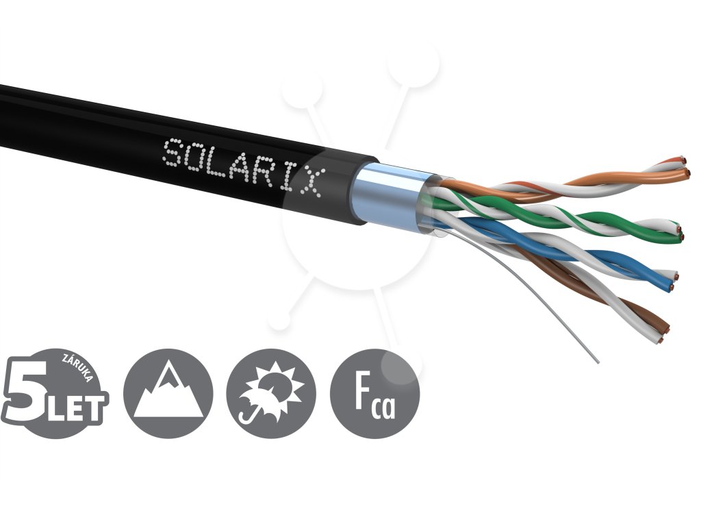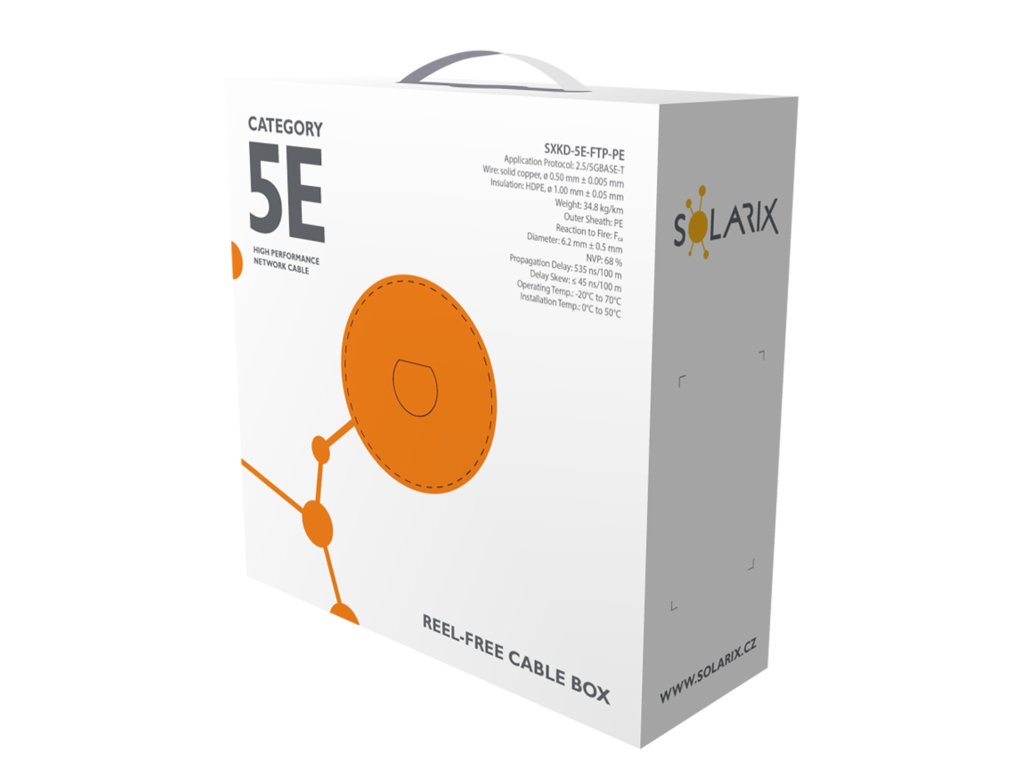 Instalační kabel Solarix s označením SXKD-5E-FTP-PE je spolehlivý venkovní stíněný kabel kategorie 5E, který je určený pro provoz ethernetových protokolů, včetně 2.5GBASE-T a 5GBASE-T*. Konstrukce kabelu je F/UTP, typ pláště UV stabilní PE s třídou reakce na oheň Fca a stupněm krytí IP67. Vodiče kabelu jsou vyrobeny z kvalitního měděného drátu s čistotou mědi 99,97 %. Kabel bez problémů splňuje požadavky z mezinárodních standardů ISO/IEC 11801, EN 50173 a ANSI/TIA 568.2-D. Stejně jako ostatní kabely Solarix, je i kabel SXKD-5E-FTP-PE značen metráží po 1 m v rozsahu od 0 do 100 m. Kabel je dodáván ve vysoce odolném třívrstvém leštěném kartónovém boxu (vždy barevně odlišeném podle typu kabelu), na kterém jsou uvedeny všechny nezbytné produktové informace, včetně čárových kódů, výrobní šarže, popisu a nejdůležitějších technických parametrů. Tento kabel není určen pro trvalé uložení do vody ani do země bez odpovídající řádné ochrany. Technické parametry Kategorie: CAT5E Podporované protokoly: 2.5/5GBASE-T a nižší Stínění: fólie kolem všech 4 párů Šířka pásma: 100 MHz Typ a velikost vodiče: měděný drát 0,50 mm ± 0,005 mm Izolace a průměr vodiče s izolací: HDPE 1,0 mm Třída reakce na oheň, typ pláště: Fca, PE Barva pláště: černá RAL 9005 Průměr kabelu: 6,2 mm Váha: 34,8 kg/km NVP: 68 % Propagation delay: 535 ns/100 m Delay skew: nižší než 45 ns/100 m Skladovací teplota: -20 °C až 70 °C Provozní teplota: -20 °C až 70 °C Teplota při instalaci: 0 °C až 50 °C Balení: 100 m, třívrstvý kartónový box Rozměry balení (výška x hloubka x šířka): 315 mm x 315 mm x 120 mm Počet balení na paletě: 30 boxů (velká paleta), 24 boxů (malá paleta)