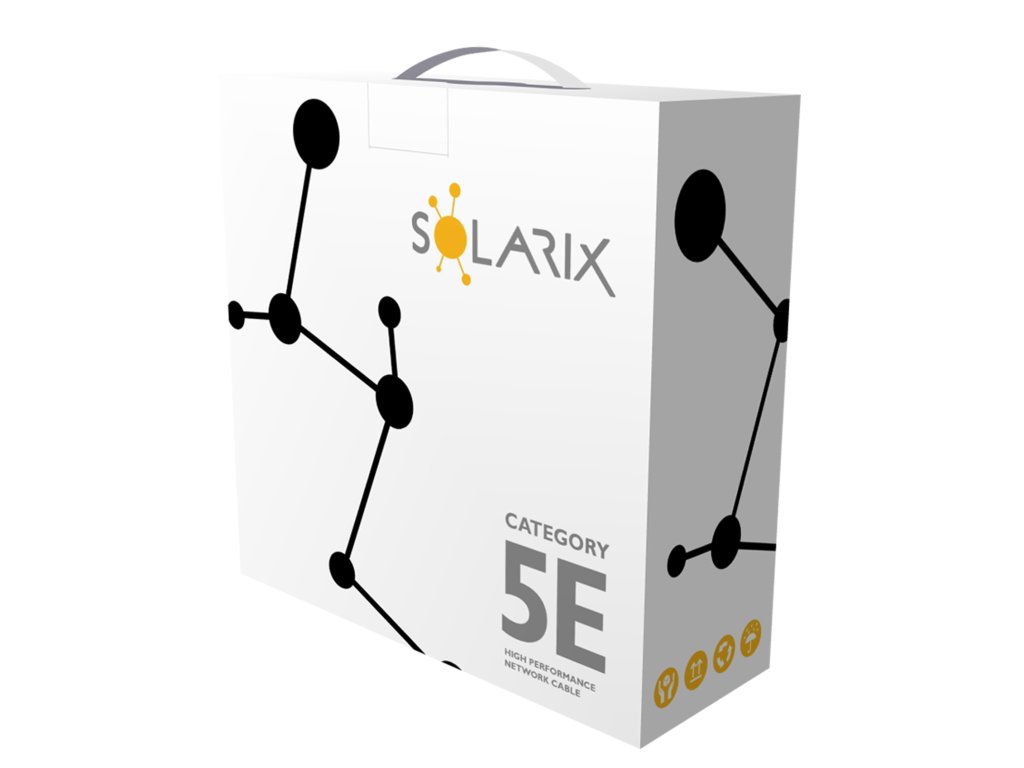 Instalační kabel Solarix s označením SXKD-5E-UTP-PE je spolehlivý venkovní nestíněný kabel kategorie 5E, který je určený pro provoz ethernetových protokolů, včetně 2.5GBASE-T a 5GBASE-T*. Konstrukce kabelu je U/UTP, typ pláště UV stabilní PE s třídou reakce na oheň Fca a stupněm krytí IP67. Vodiče kabelu jsou vyrobeny z kvalitního měděného drátu s čistotou mědi 99,97 %. Kabel bez problémů splňuje požadavky z mezinárodních standardů ISO/IEC 11801, EN 50173 a ANSI/TIA 568.2-D. Stejně jako ostatní kabely Solarix, je i kabel SXKD-5E-UTP-PE značen metráží po 1 m v rozsahu od 0 do 100 m. Kabel je dodáván ve vysoce odolném třívrstvém leštěném kartónovém boxu (vždy barevně odlišeném podle typu kabelu), na kterém jsou uvedeny všechny nezbytné produktové informace, včetně čárových kódů, výrobní šarže, popisu a nejdůležitějších technických parametrů. Tento kabel není určen pro trvalé uložení do vody ani do země bez odpovídající řádné ochrany. Technické parametry Kategorie: CAT5E Podporované protokoly: 2.5/5GBASE-T a nižší Stínění: ne Šířka pásma: 100 MHz Typ a velikost vodiče: měděný drát 0,50 mm ± 0,005 mm Izolace a průměr vodiče s izolací: HDPE 0,88 mm Třída reakce na oheň, typ pláště: Fca, PE Barva pláště: černá RAL 9005 Průměr kabelu: 5,0 mm Váha: 27,6 kg/km NVP: 68 % Propagation delay: 535 ns/100 m Delay skew: nižší než 45 ns/100 m Skladovací teplota: -20 °C až 70 °C Provozní teplota: -20 °C až 70 °C Teplota při instalaci: 0 °C až 50 °C Balení: 100 m, třívrstvý kartónový box Rozměry balení (výška x hloubka x šířka): 260 mm x 260 mm x 120 mm Počet balení na paletě: 128 boxů
