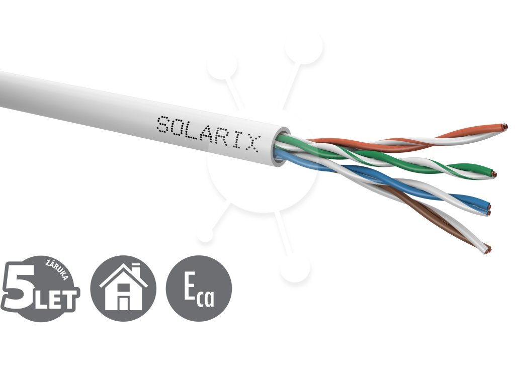 Instalační kabel Solarix s označením SXKD-5E-UTP-PVC je spolehlivý nestíněný kabel kategorie 5E, který je určený pro provoz ethernetových protokolů, včetně 2.5GBASE-T a 5GBASE-T*. Konstrukce kabelu je U/UTP, typ pláště PVC s třídou reakce na oheň Eca. Vodiče kabelu jsou vyrobeny z kvalitního měděného drátu s čistotou mědi 99,97 %. Kabel bez problémů splňuje požadavky z mezinárodních standardů ISO/IEC 11801, EN 50173 a ANSI/TIA 568.2-D. V případě CPR (nařízení EU č. 305/2011) je kabel testován u nezávislé laboratoře FORCE TECHNOLOGY v systému posuzování vlastností AVCP 3. Stejně jako ostatní kabely Solarix, je i kabel SXKD-5E-UTP-PVC značen metráží po 1 m v rozsahu od 0 do 305 m. Kabel je dodáván ve vysoce odolném třívrstvém leštěném kartónovém boxu (vždy barevně odlišeném podle typu kabelu), na kterém jsou uvedeny všechny nezbytné produktové informace, včetně čárových kódů, výrobní šarže, popisu a nejdůležitějších technických parametrů. Technické parametry Kategorie: CAT5E Podporované protokoly: 2.5/5GBASE-T a nižší Stínění: ne Šířka pásma: 100 MHz Typ a velikost vodiče: měděný drát 0,50 mm ± 0,005 mm Izolace a průměr vodiče s izolací: HDPE 0,88 mm Třída reakce na oheň, typ pláště: Eca, PVC Barva pláště: šedá RAL 7035 Průměr kabelu: 5,0 mm Váha: 29,2 kg/km NVP: 68 % Propagation delay: 535 ns/100 m Delay skew: nižší než 45 ns/100 m Skladovací teplota: -20 °C až 60 °C Provozní teplota: -20 °C až 60 °C Teplota při instalaci: 0 °C až 50 °C Balení: 305 m, třívrstvý kartónový box Rozměry balení (výška x hloubka x šířka): 350 mm x 350 mm x 205 mm Počet balení na paletě: 45 boxů