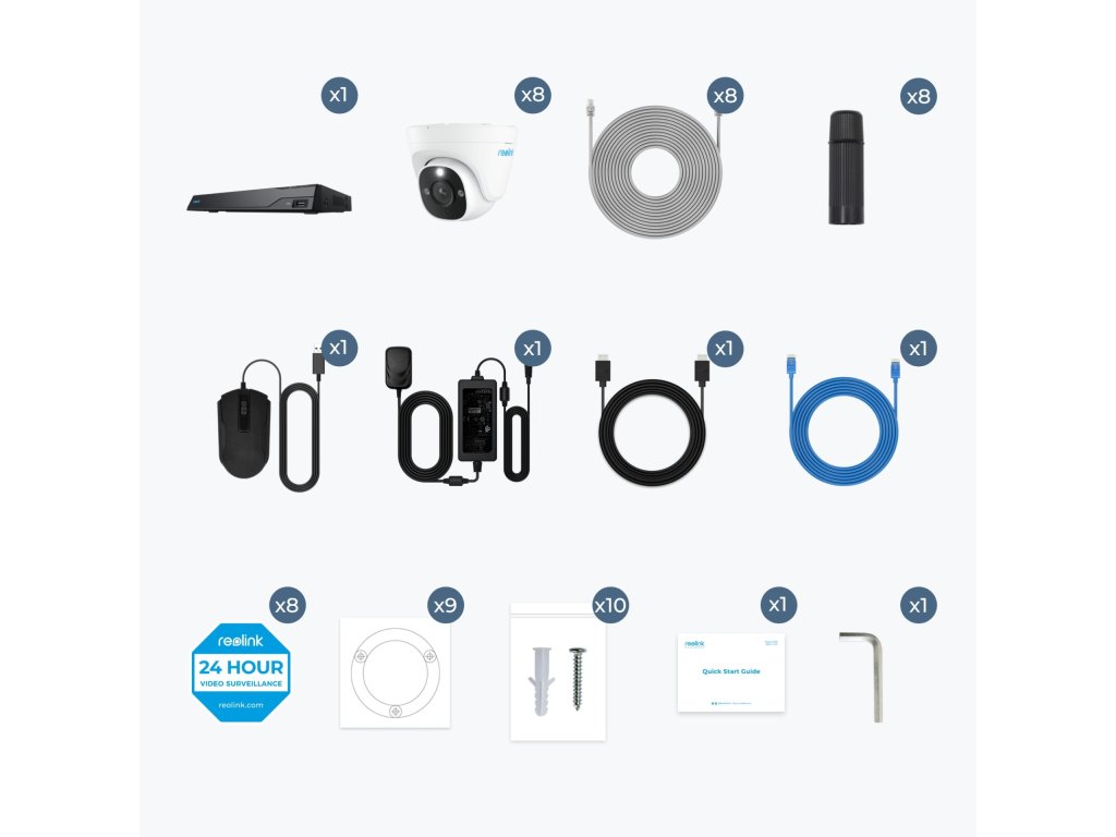 Obsah balení: NVR jednotka, 8 x kamera, 8 x vodotěsné víko, NVR napájecí adaptér, HDMI kabel, USB myš, 1 m ethernetový kabel, 8 x 18 m ethernetový kabel, 8 x značka videodohledu, 9 x montážní šablona, 10 x sada šroubků, klíč, návod k použití.