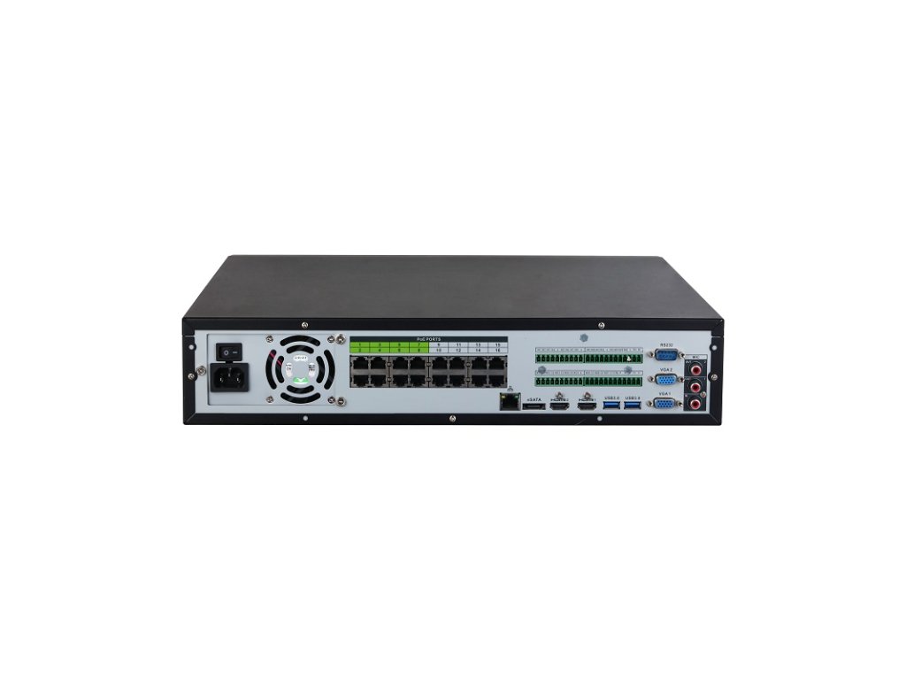 Videorekordér IP sieťový 16kanálový, záznam / živý obraz / prehrávanie vo 4K, podporované formáty H.265+ / H.265 / H.264+ / H.264 / MJPEG, záznam max. do 384 Mbps, maximálne rozlíšenie 32 Mpx na kameru, alarm I/O 16/8, audio 1/2 RCA, 8x SATA III 3,5" max. 16 TB HDD, 1x eSATA, podpora ONVIF, podpora IP PTZ Dahua a ITC kamier, AI by NVR - 4 kanály pre Perimeter Protection alebo 2 kanály pre Face Detection / Recognition vďaka NVR AI, 8 kanálov pre SMD plus vďaka NVR, 1x RJ-45 port (10/100/1000 Mbps), 16x port PoE, 1–8 podpora ePoE (na jeden port max. 25,5 W, max. 130 W), 2x HDMI (4K), 2x VGA, 1x RS-485, 1x RS-232, 4x USB (2x USB 3.0), rozmery 2U, 440,1 × 457,9 x 89,1 mm, hmotnosť 6,9 kg (bez HDD)
