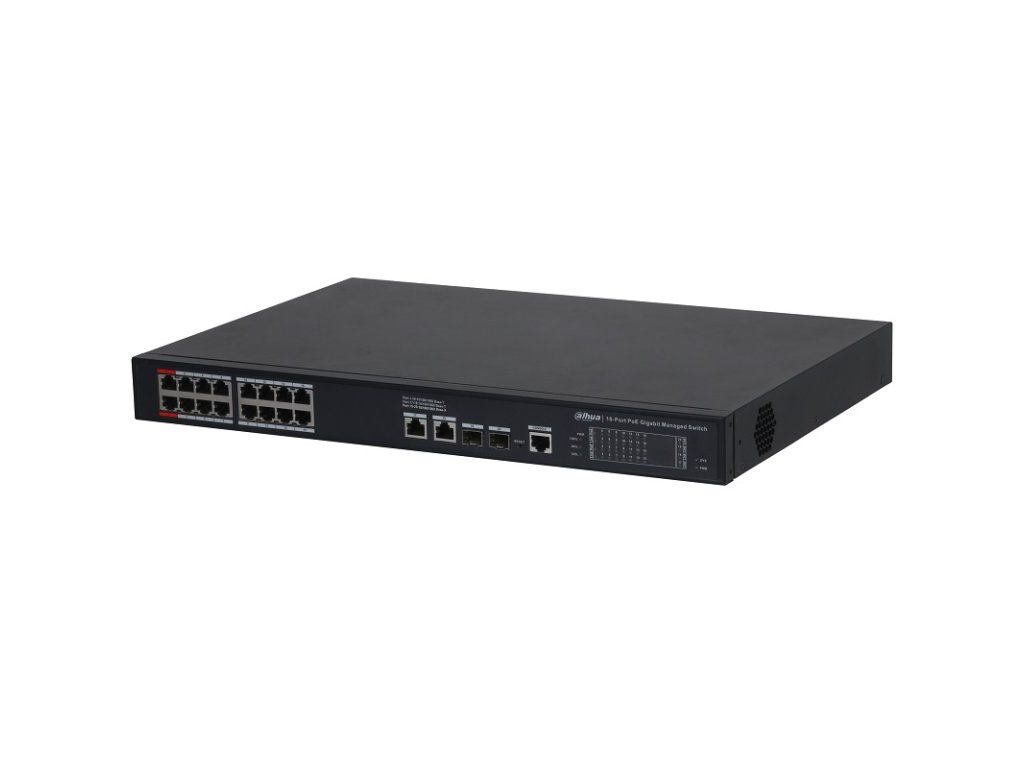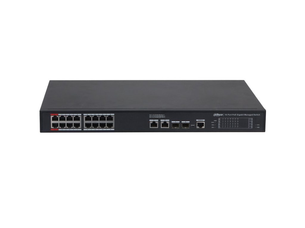 20 portový manažovatelný switch značky Dahua so 16 PoE+ portami. Porty 1-2 podporujú štandard PoE++ (90 W) celková spotreba môže byť maximálne 240 W. Switch má navyše aj 2 SFP porty. Všetky porty podporujú prenosovú rýchlosť 1 Gbps. Pre jednoduchú správu nemôže chýbať minimalistické webové rozhranie.