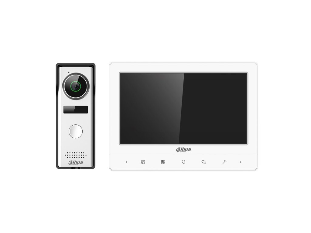 Dahua analogová sada, 4-vodičový systém, biely monitor VTH1020J, 7" farebný LCD displej s rozlíšením 1024 x 600 px, dotykové tlačidlá, rozmery 182 x 134 x 17 mm, dverná jednotka VTO1000J, biely plast, 1 mechanické tlačidlo, kamera 1,3 Mpx CMOS, uhol záberu 70°, 1x ovládanie zámku, IP 65, rozmery 132 x 46 x 34 mm, systémové napájanie externým zdrojom zapojeným do monitora (zdroj je súčasťou balenia), podpora analog kamier, balenie obsahuje konektory na pripojenie jednotiek, montážne prvky