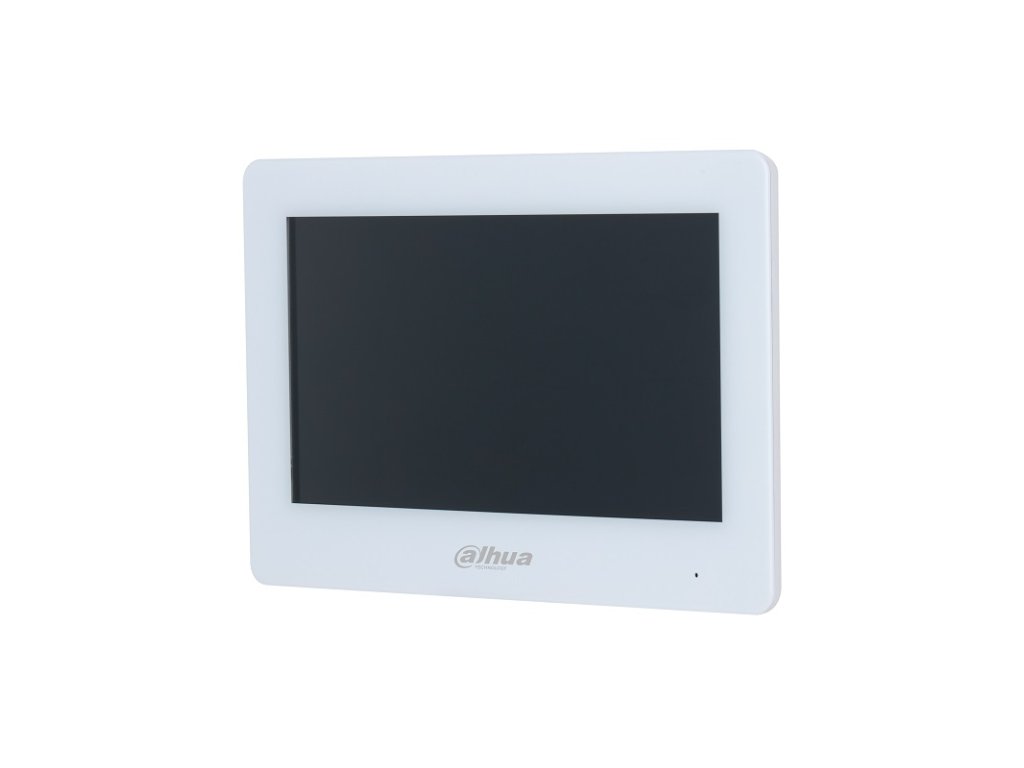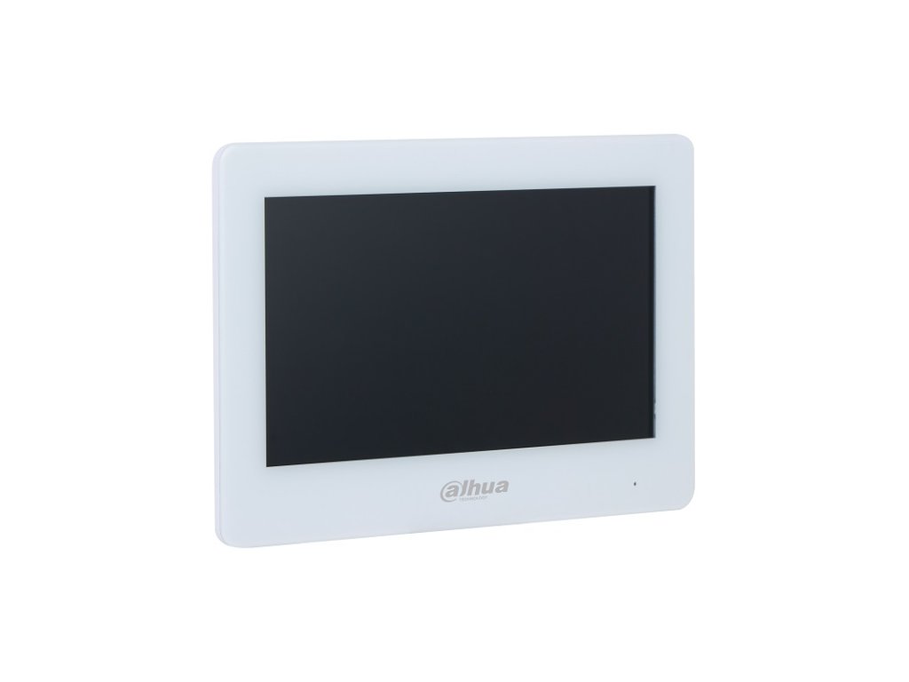 2-Wire Dahua handsfree videomonitor, prevedenie biely plast, 7" farebný dotykový LCD displej s rozlíšením 1024 x 600 px, kompresia H.264 a H.265, komunikácia TCP/IP alebo Dahua 2-Wire(nepolarizovaný 2-vodič), Wi-Fi IEEE802.11b/g/n, grafické menu, dotykové tlačidlá, možnosť automatického vytvorenia obrázkov pri neprijatom hovore alebo videa pri zanechaní odkazu po vložení micro SD karty max. 64 GB (karta nie je súčasťou balenia), interkom v rámci viacerých monitorov v byte (max. 3 monitory), pripojiteľnosť až 20 dverných jednotiek, možnosť pripojenie externých CCTV Dahua IP kamier, podpora prenosu videohovoru / Push notifikácie na Android a iOS smartfony cez internet (aplikácia DMSS), 1x RJ-45 10/100Mbps konektor pre pripojenie do siete, 6x NO kontakt pre pripojenie alarmových vstupov - funkcia EZS ústredne, 1x NO alarmový výstup, ovládanie 2 zámkov (pri kombinácií s podporovanou dvernou jednotkou a modulom druhého zámku DEE1010B), prizvonenie od dverí, napájanie externým zdrojom 48 V DC / 1250 mA (zdroj nie je súčasťou balenia), alebo switchom Dahua VTNS2003B-2, montáž na povrch, rozmery 189,0 x 130,0 x 26,9 mm, interiérové použitie