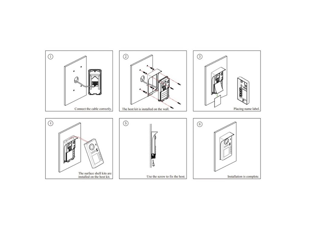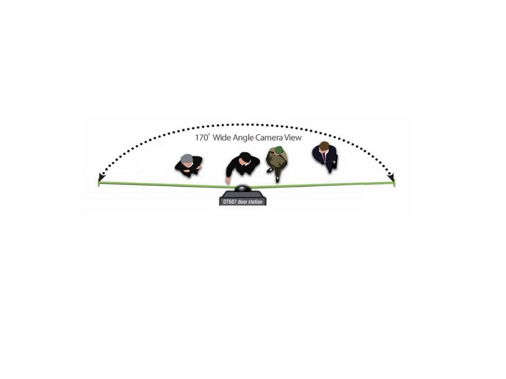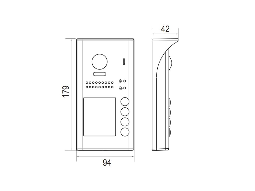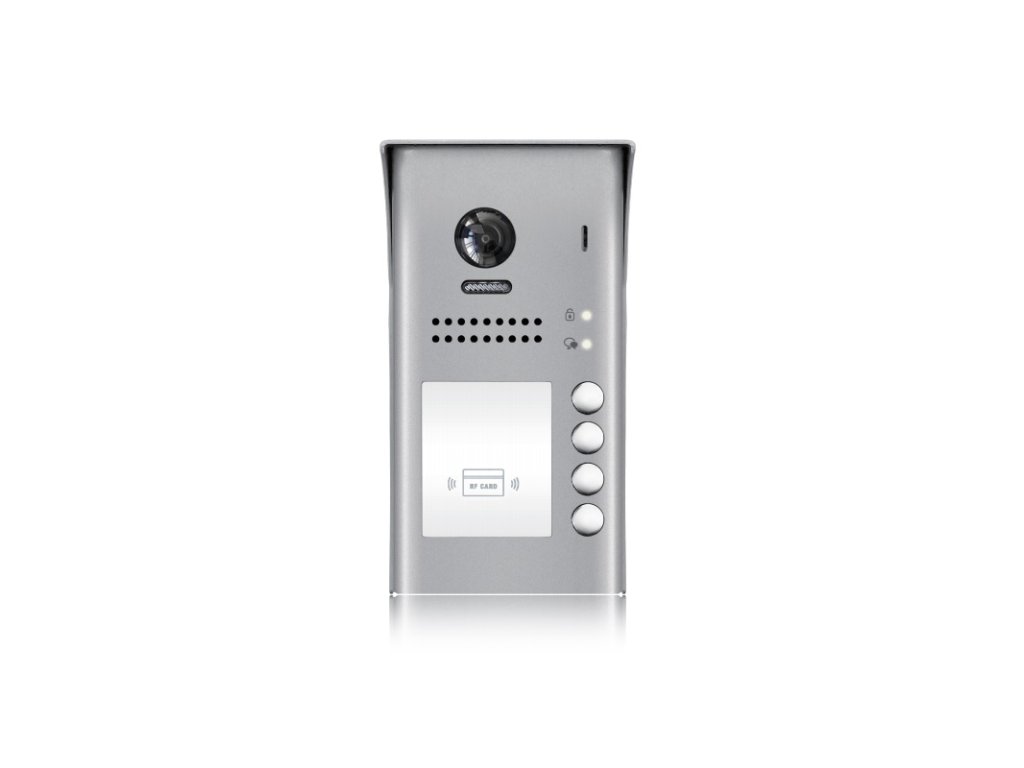 Dverná kamerová jednotka farebná so štyrmi tlačidlami a 125 kHz RFID čítačkou, kapacita 320 kariet, podsvietená menovka a LED indikácia, prevedenie kov, prisvetlenie snímaného priestoru, širokouhlá kamera 170°, IP 54, 12 V DC alebo relé ovládanie pre 1 zámok, pridávanie/odoberanie kariet cez master karty, rozmery 179 x 94 x 42 mm, so strieškou, napájanie 24 V DC zo zbernice systému, montáž na omietku, dvojvodičový systém zapojenia – nepolarizovaný, odporúčaný netienený krútený pár, min. 2x 1 mm