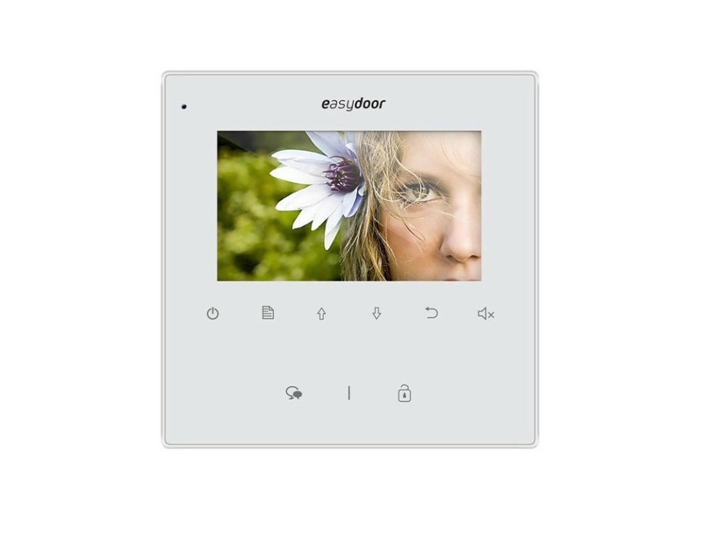 Handsfree domáci videomonitor značky Easydoor s 4,3" farebným LCD displejom. Monitor sa ovláda dotykovými tlačidlami a má možnosť interkomu medzi bytmi.
