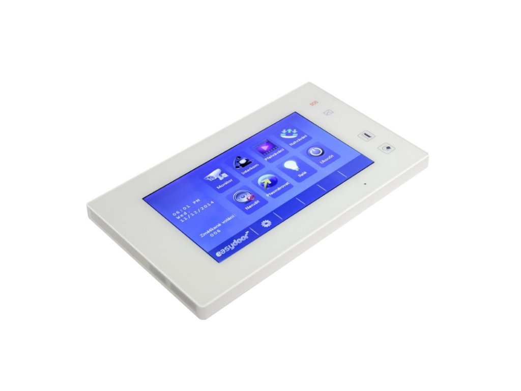 Easydoor handsfree videomonitor, slim dizajn, prevedenie biely plast, 7" farebný dotykový LCD displej, grafické menu, interná pamäť 118 snímkov pri zazvonení (možnosť doplnenia MicroSD karty pre rozšírenie kapacity pamäte pre videozáznam), interkom medzi bytmi, skupinové volanie v rámci viacerých monitorov v byte, kontakt prídavného zvonenia od dverí bytu, 12 V DC výstup na doplnkové prizvonenie, nezávislé ovládanie 2 zámkov, adresácia cez menu, znížený odber, napájanie 24 V DC zo zbernice systému (odporúčaný krútený pár, min. 2 x 1 mm), montáž na povrch, rozmery 226 x 132 x 18 mm, interiérové použitie